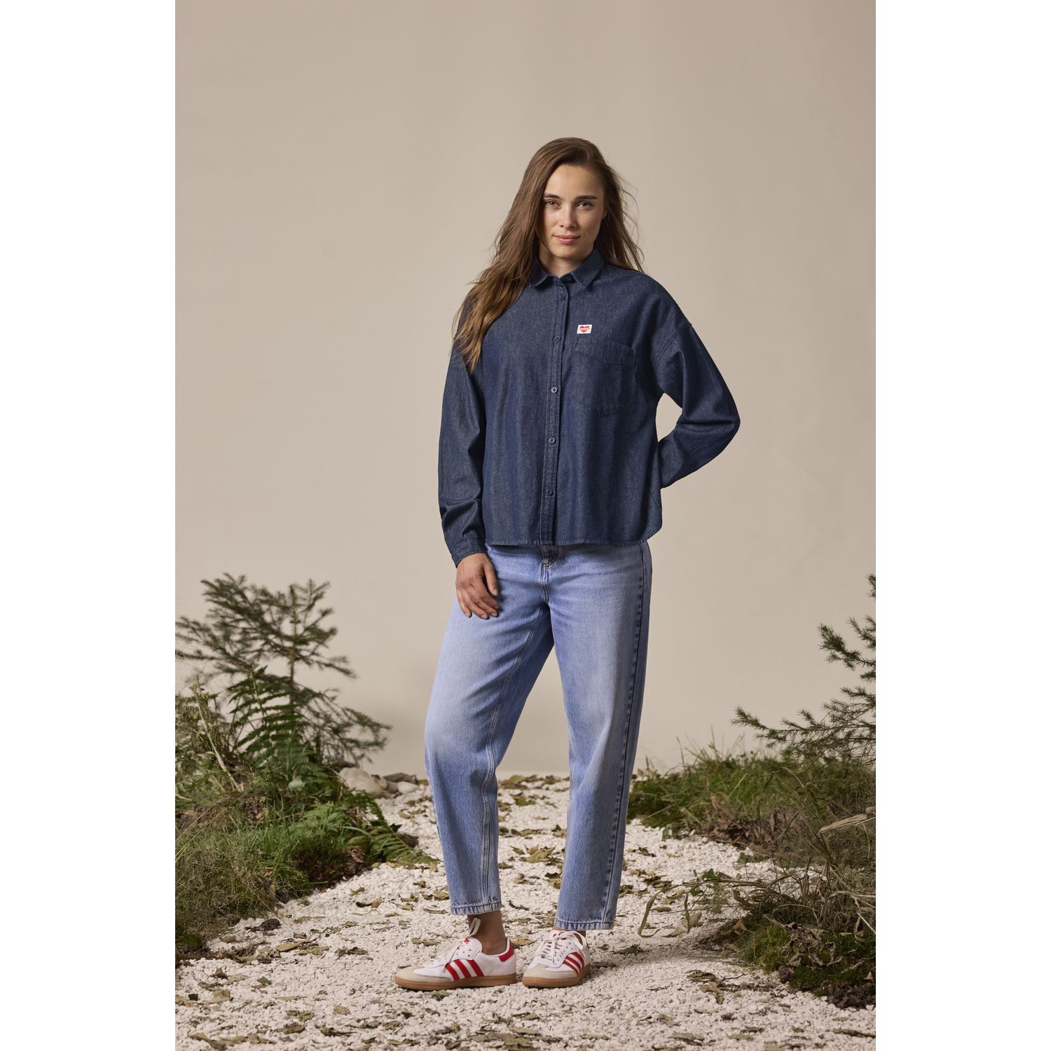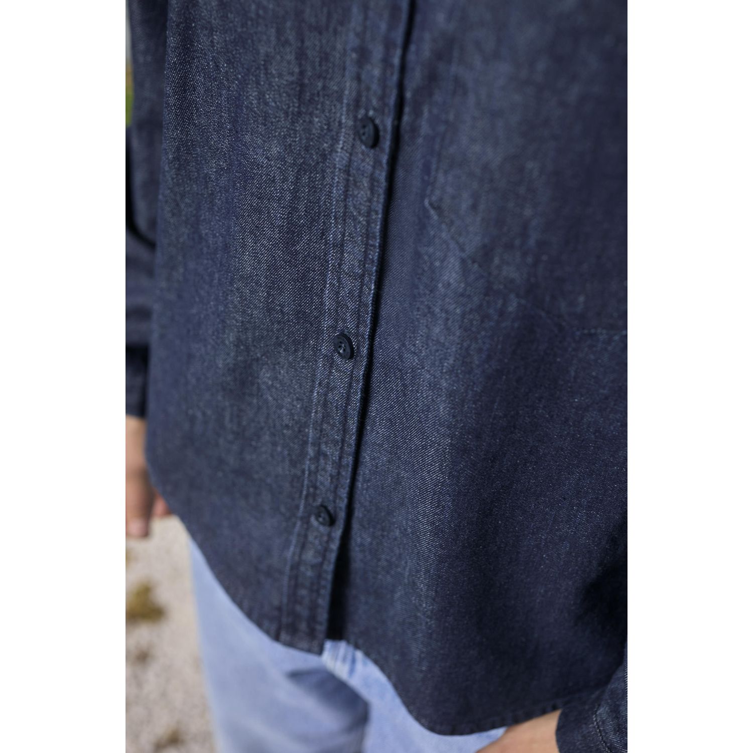 Ova ležerna teksas bluza kombinuje klasične detalje poput našivenog džepa na grudima, kopčanja na dugmad i Kent kragne sa modernim, ženstvenim krojem. Ramena su spuštena, rukavi su široki, a nabor na leđima dodaje volumen i udobnost.