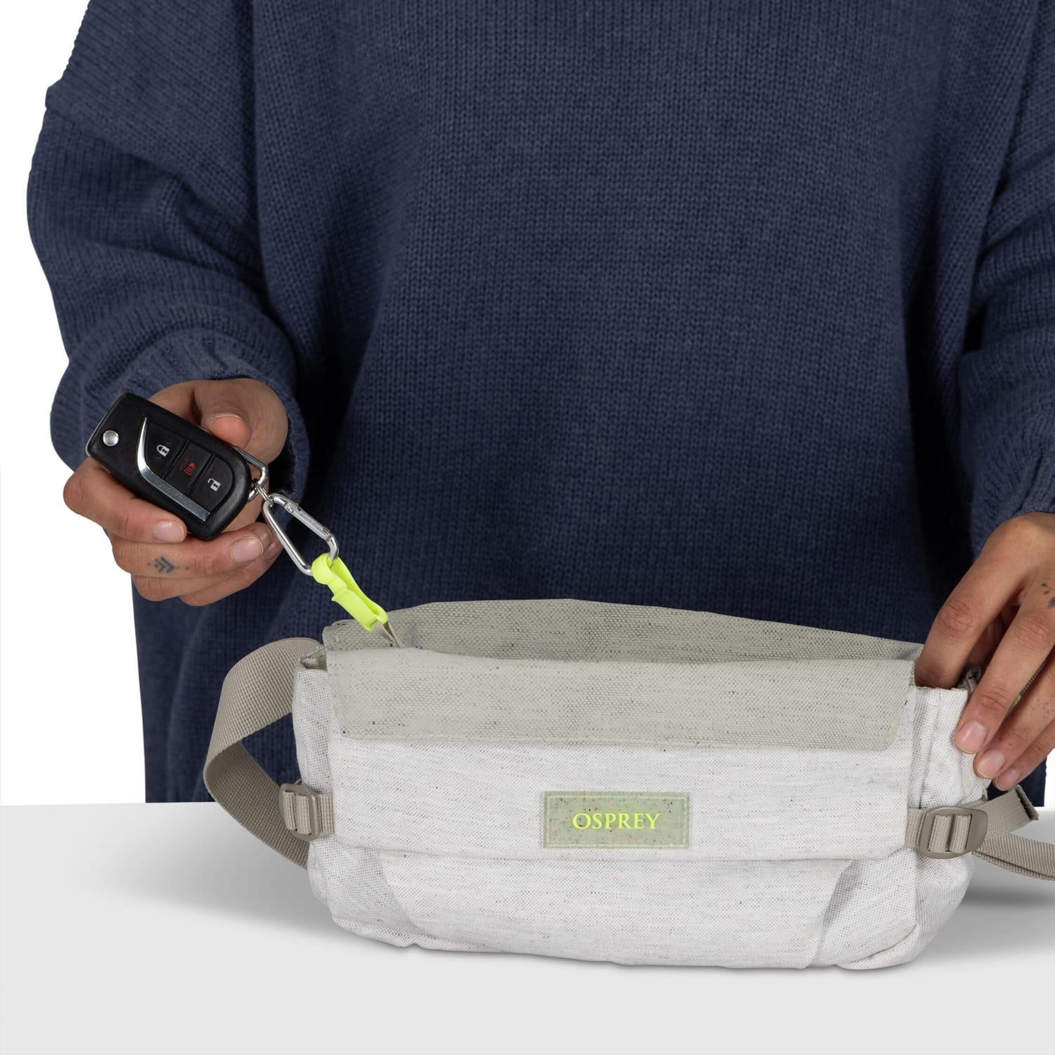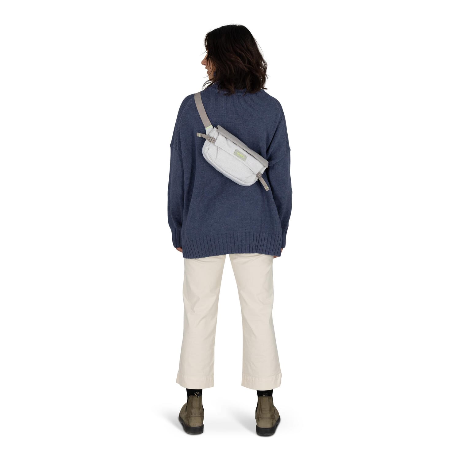 Održiva i moderna torbica zapremine 2 litra, napravljena od 100% recikliranih fabričkih materijala sa brzim magnetnim pristupom i diskretnim sigurnosnim džepovima.